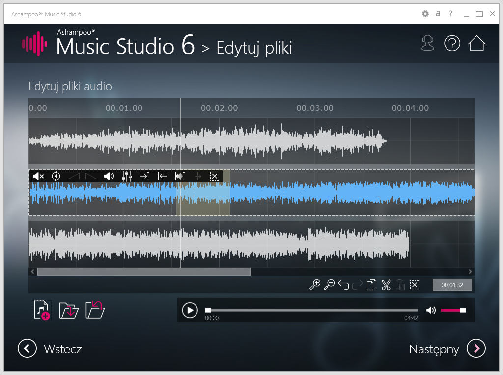 Miksuj utwory z aż do 3 ścieżek, edytuj części lub twórz eleganckie miksy. Edytowanie muzyki staje się bezproblemowe dzięki Ashampoo Music Studio 6. Odcinaj lub dodawaj nowe fragmenty, przejścia lub zmieniaj ustawienia korektora graficznego dla jeszcze lepszych efektów.